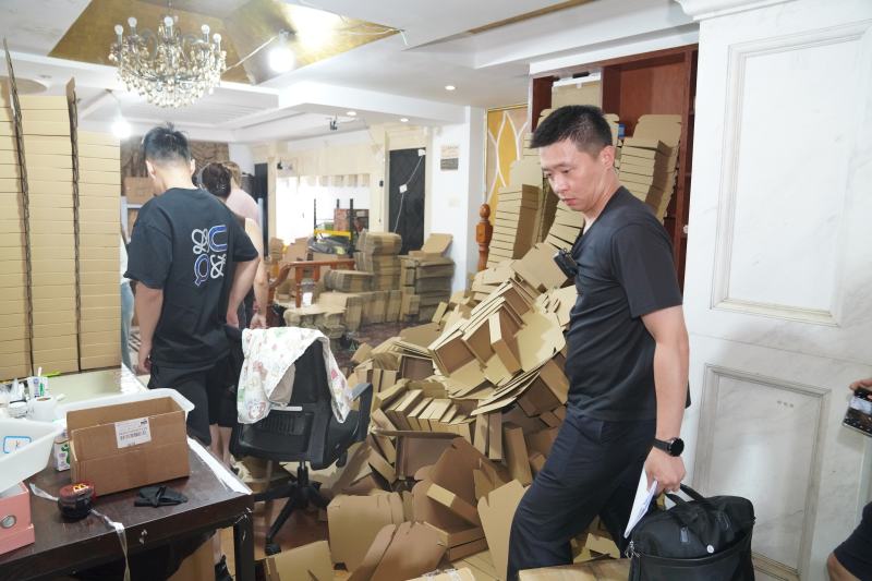 随后,宝山警方对该售假团伙开展围聚收网行径,成效将薛某等22名违规嫌疑东说念主一举抓获,现场查获的产物价值超2000万元,累计销售金额超5000万元。从警方现场抓捕视频不错看到,别墅内,各式品牌首饰盒子堆成“小山”,假冒产物按不同型号有序摆设;另一间房子里,则放着好多品牌包装材料。